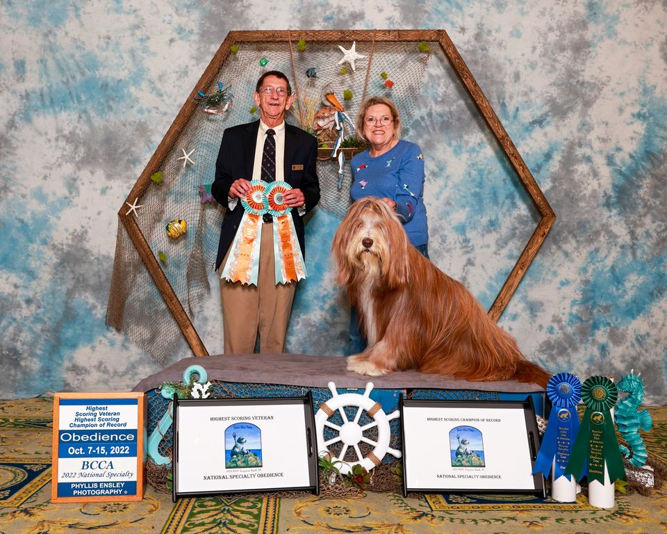 Fudge and Dinah went to the National and had a great time. Thank you National Capital Beardies. I am so proud of Fudge he got his 2nd leg in obedience novice B and ended up with Highest Scoring Veteran and Highest Scoring Champion on Record. Then in Rally he finished his intermediate title and a 2nd leg in advance inwhich he has had no pratice off leash except in OBD.